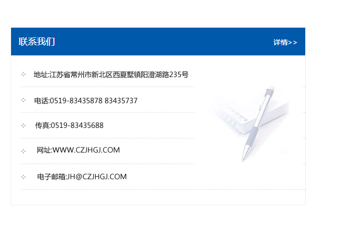 地址:常州市新北區友邦商務大廈1幢16、17層  電話:0519-85101652  傳真:0519-85112595  郵編:213022  網址:www.cz-jiayue_cn.liuzugusi.com  郵箱:xiajifengaa@163.com